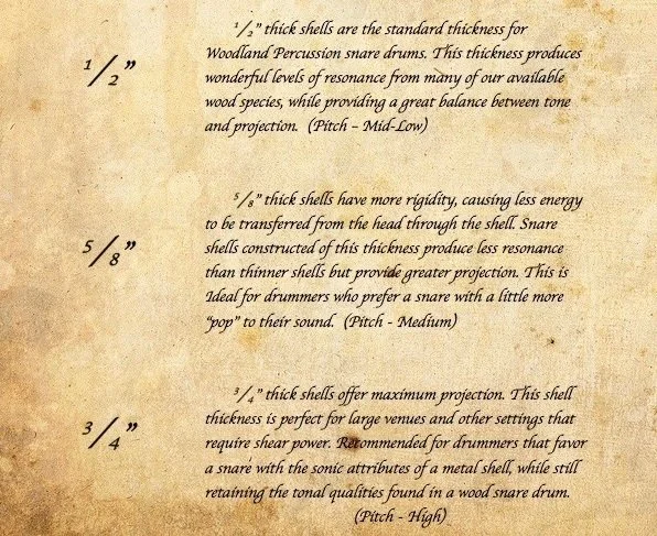 All Woodland Percussion stave snares are available in the following shell thicknesses. The thickness of the shell greatly affects the drum's fundamental pitch and tone. This, in conjunction with each wood species' own tonal characteristics will play a part in creating the unique sound you wish to achieve.